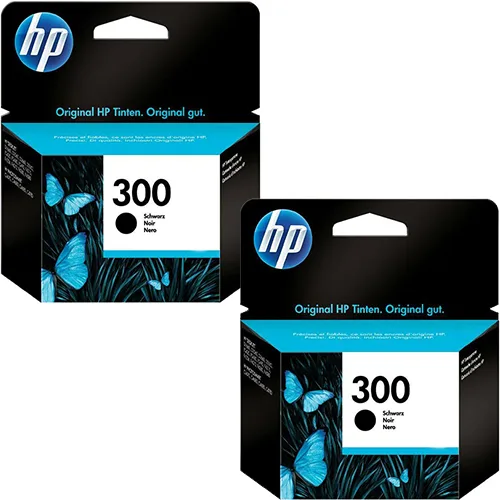 This genuine Original HP 300 twinpack contains two black HP 300 ink cartridges. Each standard capacity cartridge contains 4ml of ink, providing an approximate total yield of 600 pages. Offering exceptional print quality at affordable prices, this cartridge twinpack contains the perfect ink for your HP printer.